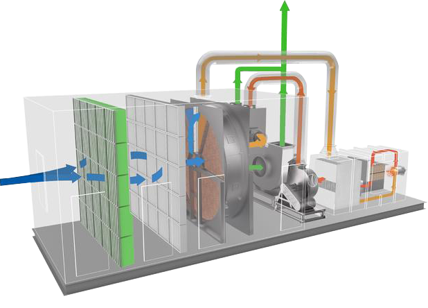 4、脱附—催化燃烧系统结构精巧,热风复式循环蓄热系统,热效率高,能量损失少,实现了脱附吸热与燃烧放热的热平衡,即燃烧过程不耗用外加电能,能耗特别低。